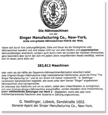Auch   mit   verschiedenen   Zeitungen   legte   er   sich   an,   weil   sie   darüber   berichteten,   dass   Singer-Nähmaschinen   im   Vergleich   zu   deutschen   Produkten   schlechter abschnitten.   Die   meisten   Prozesse   verlor   Neidlinger,   doch   seine   aggressive   Umtriebigkeit   ging   weiter.   So   führte   er   schon   recht   früh,   die   von   Singer   bereits   in   den USA   erprobten   Ratenzahlungen   ein,   oder   er   kaufte   seine   gebrauchten   im   Wettbewerb   mit   deutschen   Produkten   schlechter   abgeschnittenen   Singer-Nähmaschinen für   rund   10   Mark   auf,   ergänzte   sie   durch   geringfügige   Verbesserungen   und   verkaufte   sie   wiederum   zum   Originalverkaufspreis.   Auch   bot   er   einer   Berliner   Zeitung hohe    finanzielle    Mittel    an,    um    die    Veröffentlichung    und    Beschwerden    der    deutsche    Nähmaschinenfabrikanten    zu    verhindern,    die    ihm    darin    unlautere Machenschaften unterstellten. Nicht   weniger   freundlich   war   der   Umgang   Neidlingers   mit   seinen   Firmenuntergebenen.   So   befahl   er   u.a.   jedem   seiner   Vertreter,   einmal   jährlich   die   Haushalte   seines Einzugbereiches   mit   Werbematerial   zu   besuchen   und   darüber   nach   Hamburg   zu   berichten.   „Der   dafür   gezahlte   Lohn   war   gering   und   musste   durch   die   versprochene Provision   aufgebessert   werden.   Diese   war   allerdings   erst   fällig,   wenn   die   bestellte   Nähmaschine   ganz   bezahlt   war.   Blieb   aber   eine   Rate   aus   oder   der   Schuldner wurde   zahlungsunfähig,   dann   verfiel   auch   die   Provision.“   Zudem   musste   jeder   Vertreter   bei   seiner   Anstellung   1000   Mark   Kaution   hinterlegen,   die   allerdings   verfiel, wenn er kündigte oder sich um eine Anstellung bei einer anderen Nähmaschinenfirma bewarb. Aus   all   diesen   Geschäftsgebahren   wird   ersichtlich,   dass   Georg   Neidlinger   in   den   Anfangsjahren   von   „Singer“   in   Europa   unersetzlich   war.   Denn   ihr   Protagonist   war nicht   nur   ein   umtriebiger   Kaufmann   und   Organisator   sondern   auch   ein   begnadeter   Techniker,   der   die   ständige   Weiterentwicklung   seiner   „Singer-   Nähmaschinen“ vorantrieb und sich allein 40 Verbesserungen patentieren ließ. Ohne   Neidlinger   hätte   Singer   auch   nicht   diesen   außerordentlichen   Bekanntheitsgrad   in   Europa   erreicht. Als   1895   mit   der   Gründung   der   „Singer   Nähmaschinen AG“ in   Hamburg   Neidlingers   Firma   in   eine Aktiengesellschaft   umgewandelt   wurde,   trat   er   in   deren   Vorstand   ein.   Neidlingers Alleinherrschaft   ging   damit   zu   Ende. Aber   als Aktionär war er nunmehr, ohne seine bisherigen 25jährigen Einkünfte, um weitere fünf Millionen Mark reicher geworden. Seine   geschäftliche   Umtriebigkeit   ging   aber   damit   nicht   zu   Ende.   So   kaufte   er   1902   im   Auftrag   der   „Singer   AG“   für   32000   Mark   in   Wittenberge   an   der   Elbe   ein   fast fünf   Hektar   großes   Gelände,   auf   dem   ein   Jahr   später   die   Singernähmaschinenfabrik   entstand.   Sie   wurde   allmählich   zur   einzigen,   größten   und   leistungsfähigsten Produktionsstätte   in   Deutschland   ausgebaut.   Sie   überdauerte   später   beide   Weltkriege   und   wurde   zu   DDR-Zeiten   unter   dem   Firmennamen   „Veritas“   weitergeführt, um dann unter neuen „marktwirtschaftlichen“ Bedingungen abgewickelt zu werden. So   ist   es   „eine   makabere   Ironie   des   Schicksals,   dass   sowohl   der   Initiator   für   den   Nähmaschinenstandort      Wittenberge   als   auch   sein   Liquidator   von   1992   aus Hamburg kam.“