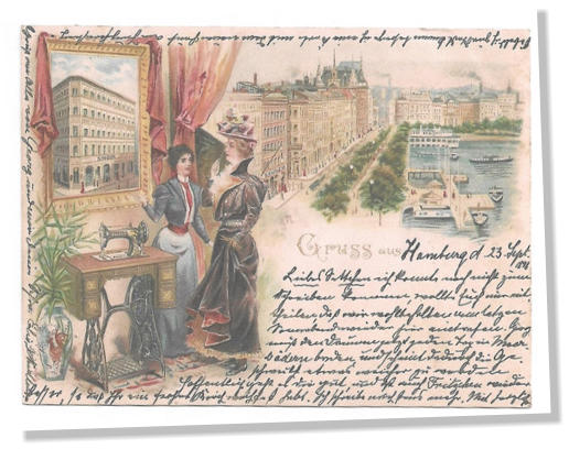 Diese Postkarte ist an Georg Neidlingers jüngste Schwester Elisabeth (1842 – 1922) gerichtet, die mit einem Johann Balz (1837 – 1907) verheiratet war. Das Ehepaar hatte den Hof der Neidlinger-Eltern (das heutige Anwesen des Weingutes Gysler) übernommen. Geschrieben hat die Postkarte Georg Neidlingers Frau. Sie hieß Elisabeth Gamlin und war eine Londoner Bankierstochter. Manches auf der Karte ist schwer zu entziffern. Vielleicht lag es daran, dass Frau Neidlinger als Engländerin die Sütterlin-Schrift nicht so gut beherrschte. Gruß aus Hamburg d. 23. Sep. 1898 Liebes Settchen (?) ich konnte noch nicht zum Schreiben kommen, wollte Euch mitteilen, daß wir wohlbehalten am letzten Sonnabend (?) wieder hier eintrafen. Georg muss den Daumen jetzt jeden Tag in Moorbädern baden und scheint dadurch die Geschwuls (?) (t)etwas weicher zu werden. Hoffentlich geht es dir gut und ist (?) auch Fritzchen wieder besser, so daß Ihr ein großes (?) Brief (?) __________________   _________________  habt. Ich schreibe euch (?) _______________ mehr. Sobald ich zum Markt (?) komme besorge ich eine Karte (?) mit dem neuen Haus am Jungferstieg. Mit herzlichem Gruß an Alle von Georg und mir . Deine Schw(ägerin) Elis(abeth) Neidlinger