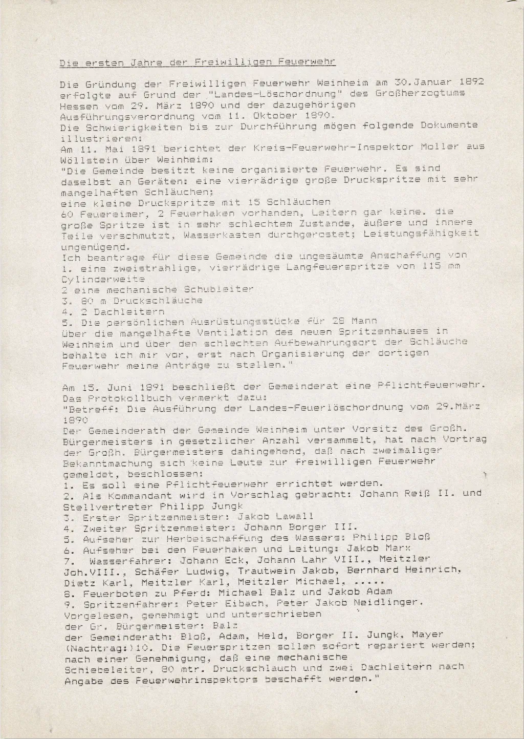 Anmerkung zu dem Bericht von Werner Konrad über die Geschichte WeinheimsInunseremOrtsarchivbefindensichdreiAufzeichnungenüberdieChronikWeinheimsvonverschiedenenVerfassern.Dieälteste GeschichtsdarstellungstammtvonGeorgRichtscheidausdemJahre1928.EineweiterewurdevonWernerKonradanlässlichdes100-jährigenJubiläumsderFeuerwehrWeinheim1992verfasst.DiemitAbstandumfangreichsteArbeit,diewissenschaftlichenAnsprüchen genügt,stammtvondemWeinheimerPfarrerKarlMüller.Dieserverfassteinseiner„GeschichteundKirchengeschichtevonWeinheim Bei Alzey“ im Jahre 1975 eine Festschrift zur Wiederindienststelltung der Evangelischen Kirche.Zur Arbeit von Werner Konrad ist folgendes anzumerken:DieWeinheimerFeuerwehrwurdenicht1802sondernerstimJahre1892gegründet.DieFeierlichkeitenfanden1992untergroßer Beteiligung der Bevölkerung statt.DiesowohlbeiRichtscheid,MüllerundKonraderwähnteErsterwähnungWeinheimslässtsichnachderzeitigenErkenntnissennichtmit dergenügendenSicherheitnachweisen.NachamtlichenStellungnahmenderLandesarchiveinSpeyerundMarburgbeziehtsichdieaus demJahre772erfolgteundurkundlicherwähnteSchenkungeinesWeinbergsnichtaufWeinheimbeiAlzey.Dieersteurkundliche Erwähnung unseres Ortes datiert vielmehr aus dem Jahre 815.