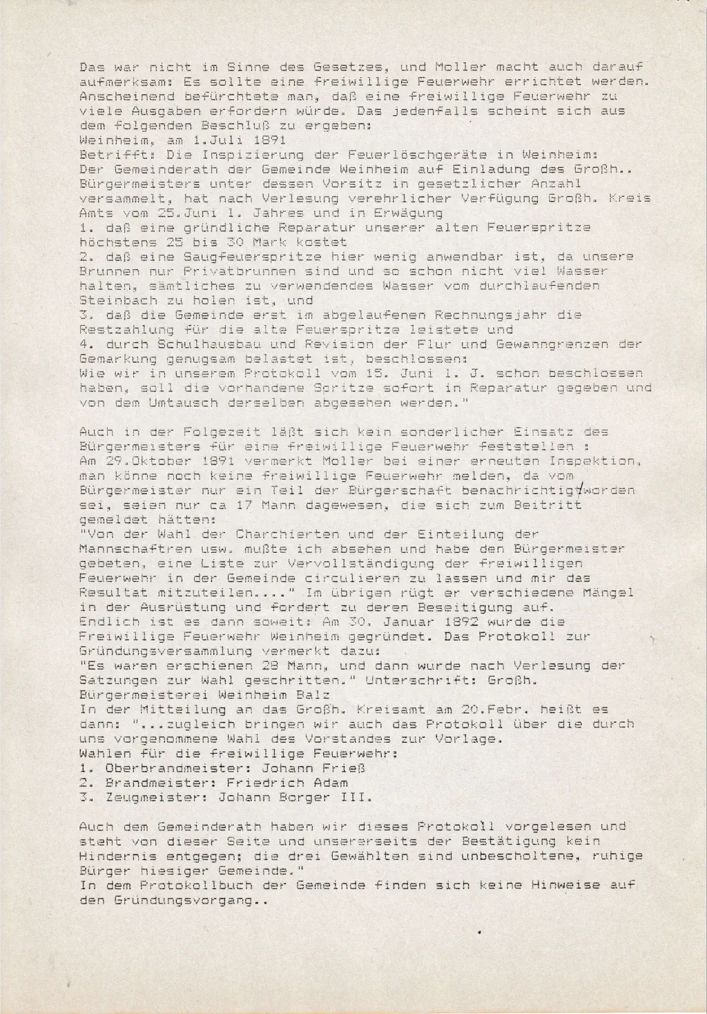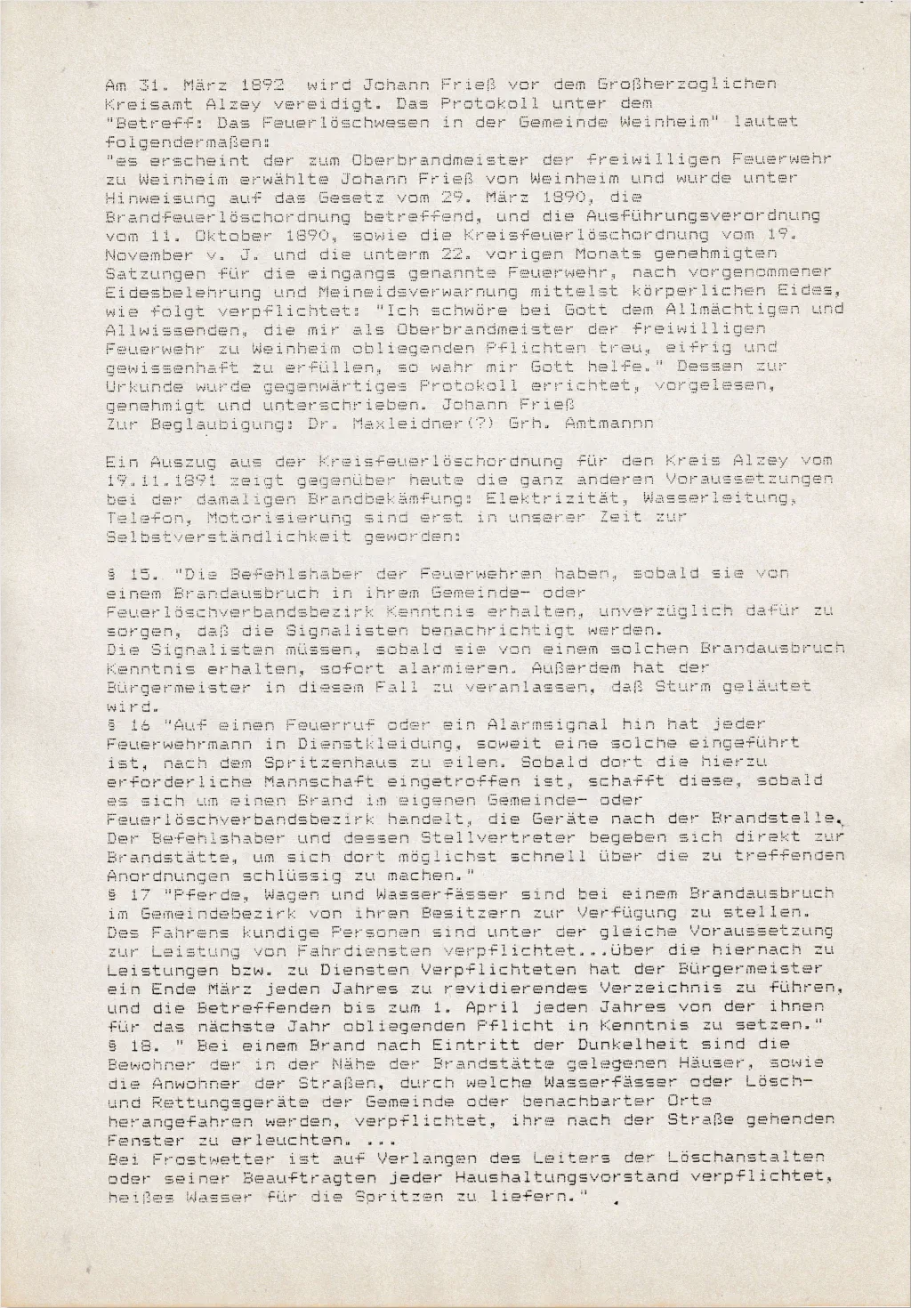 Anmerkung zu dem Bericht von Werner Konrad über die Geschichte WeinheimsInunseremOrtsarchivbefindensichdreiAufzeichnungenüberdieChronikWeinheimsvonverschiedenenVerfassern.Dieälteste GeschichtsdarstellungstammtvonGeorgRichtscheidausdemJahre1928.EineweiterewurdevonWernerKonradanlässlichdes100-jährigenJubiläumsderFeuerwehrWeinheim1992verfasst.DiemitAbstandumfangreichsteArbeit,diewissenschaftlichenAnsprüchen genügt,stammtvondemWeinheimerPfarrerKarlMüller.Dieserverfassteinseiner„GeschichteundKirchengeschichtevonWeinheim Bei Alzey“ im Jahre 1975 eine Festschrift zur Wiederindienststelltung der Evangelischen Kirche.Zur Arbeit von Werner Konrad ist folgendes anzumerken:DieWeinheimerFeuerwehrwurdenicht1802sondernerstimJahre1892gegründet.DieFeierlichkeitenfanden1992untergroßer Beteiligung der Bevölkerung statt.DiesowohlbeiRichtscheid,MüllerundKonraderwähnteErsterwähnungWeinheimslässtsichnachderzeitigenErkenntnissennichtmit dergenügendenSicherheitnachweisen.NachamtlichenStellungnahmenderLandesarchiveinSpeyerundMarburgbeziehtsichdieaus demJahre772erfolgteundurkundlicherwähnteSchenkungeinesWeinbergsnichtaufWeinheimbeiAlzey.Dieersteurkundliche Erwähnung unseres Ortes datiert vielmehr aus dem Jahre 815.